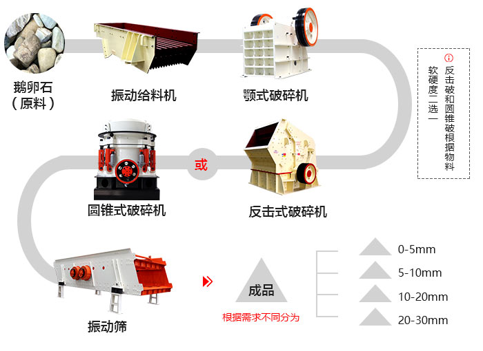 天然鵝卵石經過料倉,由振動給料機進行均勻、連續喂料,送到顎式破碎機進行初級破碎,經過初級破碎后的鵝卵石以及由振動給料機篩分的細小鵝卵石在皮帶輸送機的作用下被輸送到中轉料堆。