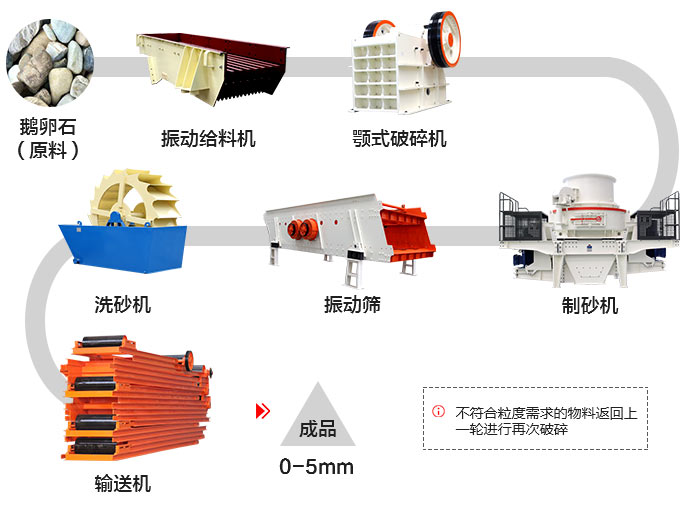 大塊的鵝卵石需要粗碎后才可以進入細碎機進行細碎,細碎粒度合適的鵝卵石被送入制砂機進行細碎加工,制砂后的鵝卵石由圓振篩進行篩分,較大粒級鵝卵石返送至制砂機再次破碎,符合需求的則由皮帶機送至儲料堆貯存制成鵝卵石砂子的物料被送入洗砂機清洗,清洗后,作為最終產品的一部分,由皮帶機傳送至儲料堆進行包裝